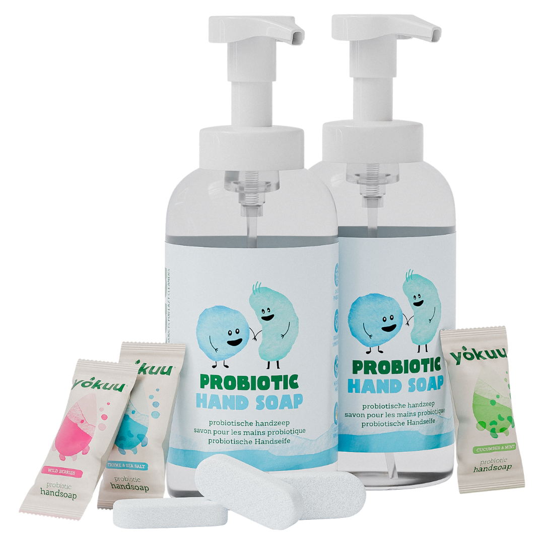 2 x Hand Soap BottlesOur foamy hand soap cleans and protects your skin’s natural balance with billions of probiotic helpers. With 3 refill pearls. Scents: Thyme & Sea Salt, Cucumber & Mint, Wild Berries